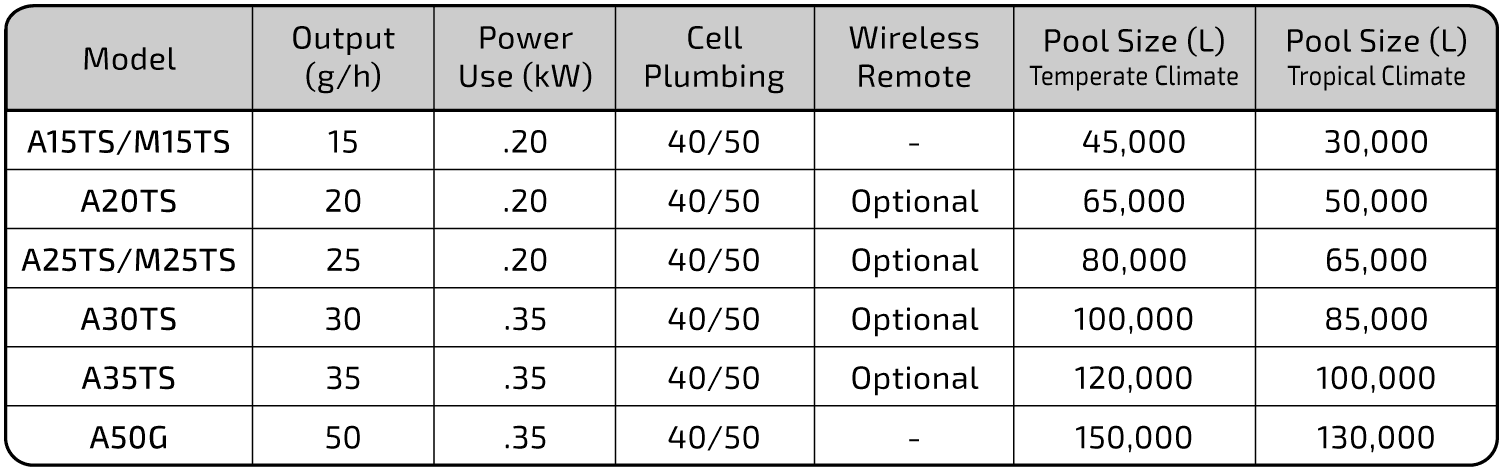‘A’ series: Automatic self-cleaning chlorinators which feature reverse polarity cell cleaning, and are available in six chlorine output models, the A15TS, A20TS, A25TS, A30TS, A35TS and the A50G.