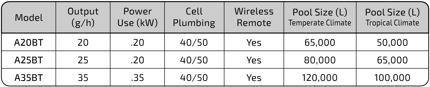 ‘A’ series: Automatic self-cleaning chlorinators which feature reverse polarity cell, remote and Bluetooth timer control, and are available in three chlorine output models, the A20BT, A25BT and A35BT.